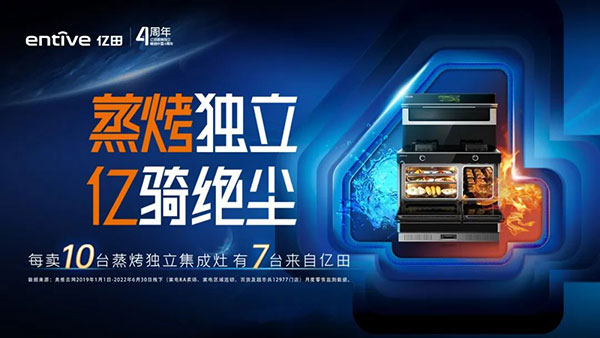 亿田集成灶研发的“2+2”模式开启独立蒸烤。7寸纯平高清显示屏,烟、灶、蒸、烤操作集成,智能菜谱一键联动,蒸箱、烤箱同步开启,15分钟即可完成10菜1汤。